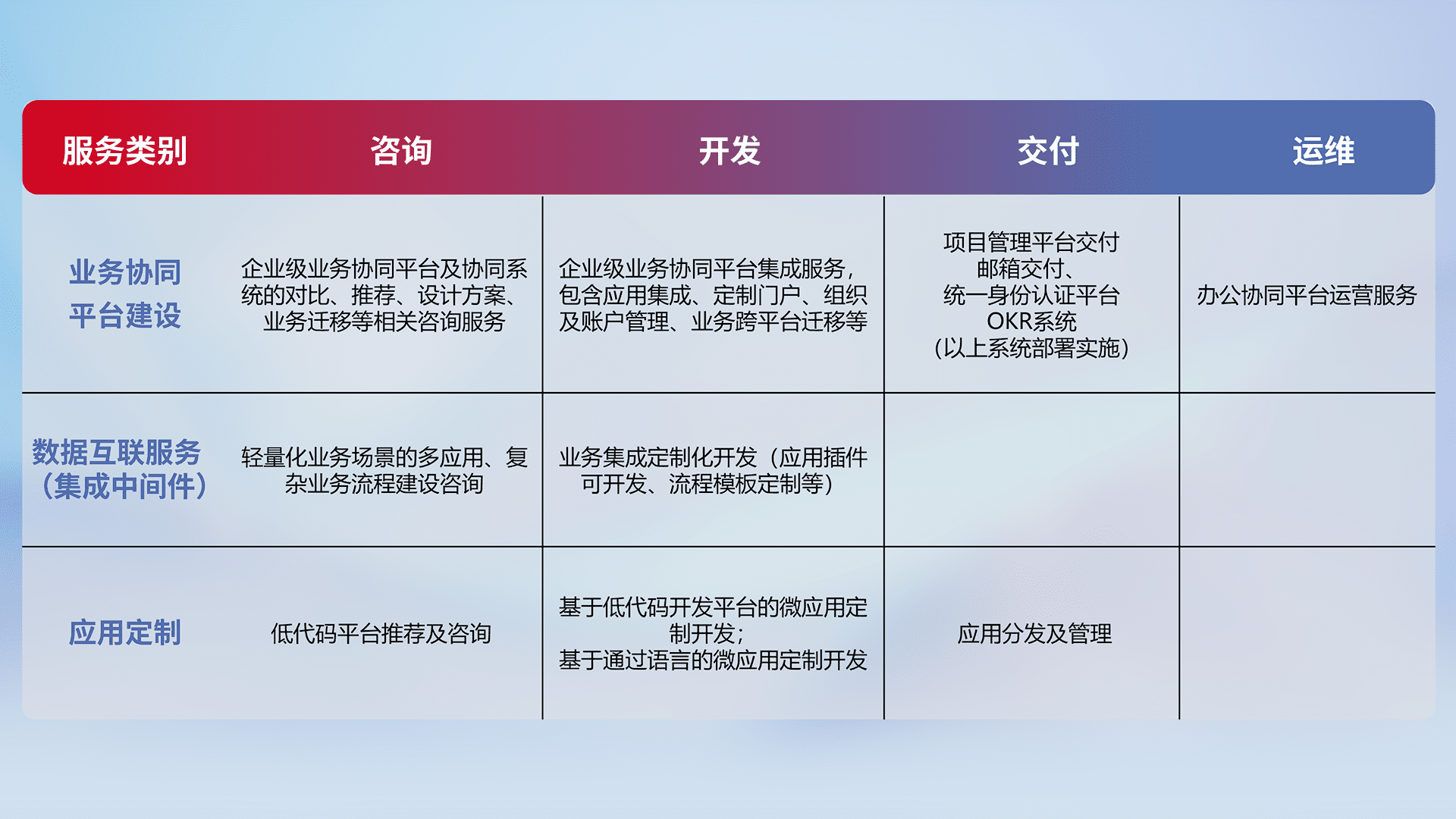 针对钉钉、、、企微、、、IDaas等平台级产品提供产品的规划、、方案、、、、交付、、、定制化开发等服务,,实现如统一协同办公、、、、智能客户服务、、混合会议管理、、、智能数据查询、、、、等业务场景,,,,实现数字化转型。。。